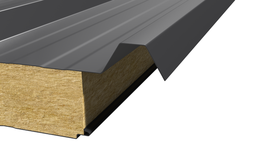 Толщина кровельных сэндвич-панелей варьируется от 50 до 300 мм, что позволяет выбрать оптимальное решение под регион эксплуатации и особенности объекта. Утеплитель из минеральной ваты обеспечивает надёжную тепло- и звукоизоляцию, а жесткие внешние оцинкованные металлические листы с антикоррозийным полимерным покрытием устойчивы к влаге, ультрафиолету и механическим повреждениям. Специальный профиль верхнего листа формирует дополнительное ребро жёсткости и улучшает водоотвод, препятствуя застою осадков на крыше.